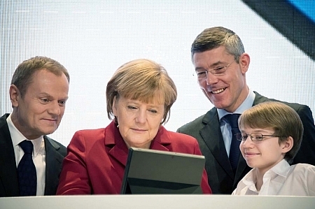 der Computermesse CeBIT(2.v.l.: Donald Tusk, Ministerpräsident Polens; 3.v.r.: Christian Illek, Vorsitzender der
