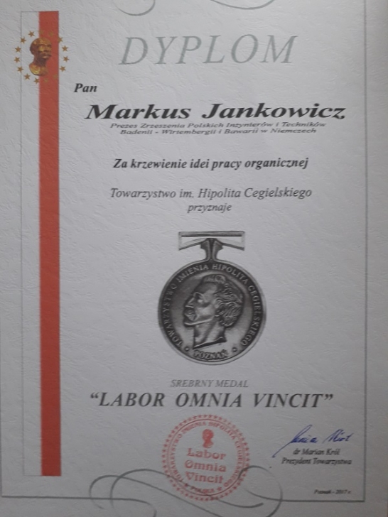 Am 4. Dezember 2017 wurde Herr Markus Jankowicz mit der Silbermedaille "LABOR OMNIA VINCIT" (Arbeit gewinnt alles) der Hipolita Cegielski Gesellschaft für die Förderung der Idee der organischen Arbeit ausgezeichnet.