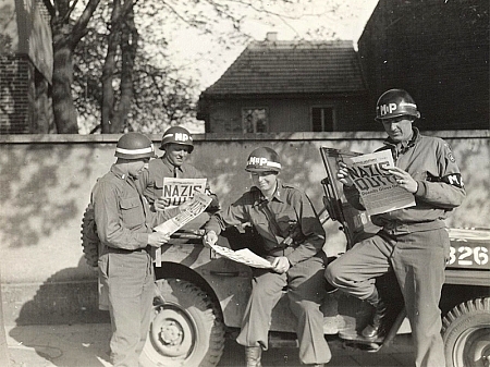 Photo: Amerikanische Militärpolizisten lesen von der Kapitulation Deutschlands in der Zeitung, Mai 1945 / US Army personnel/US Army Military History Institute/Wikimedia